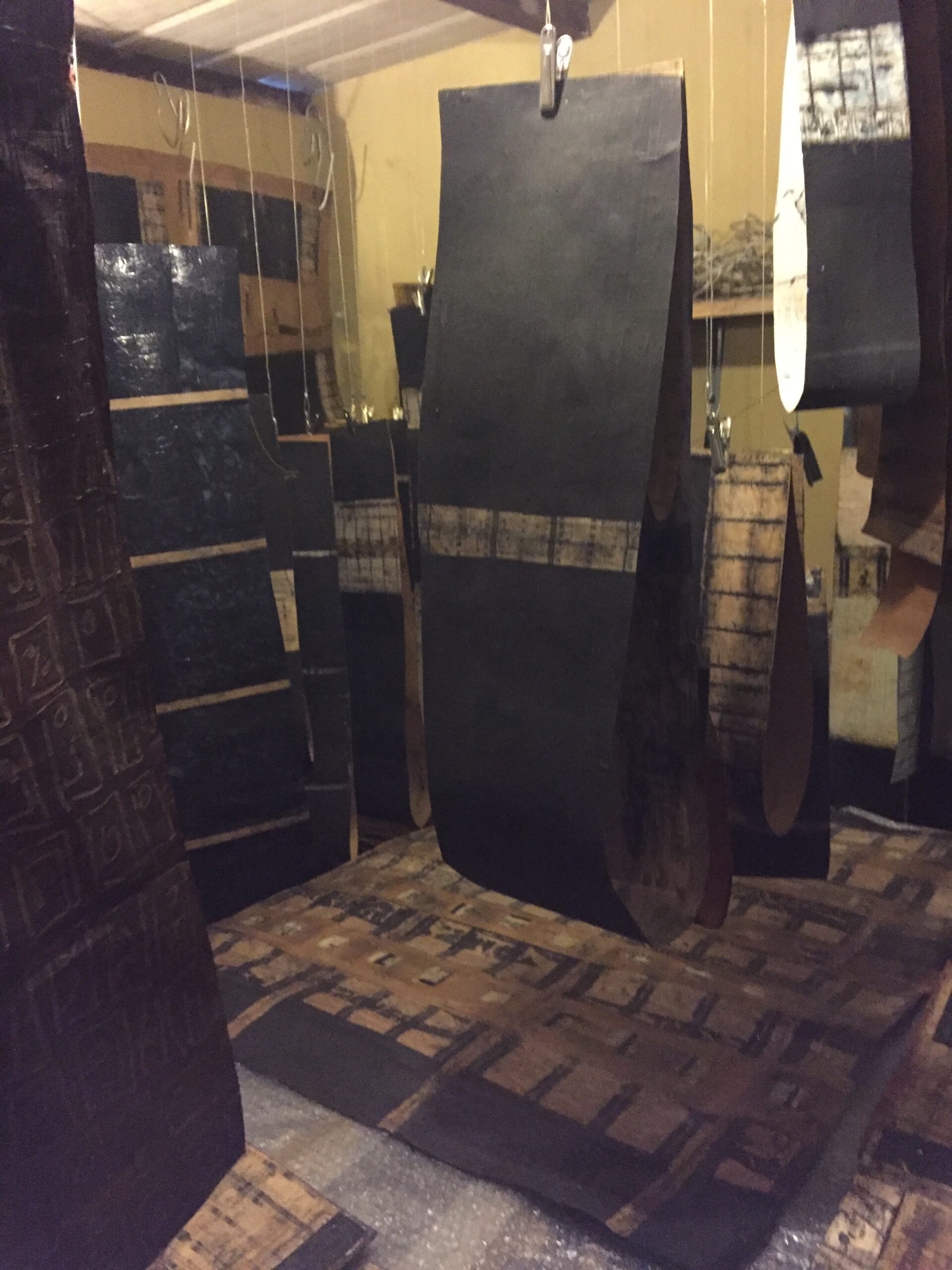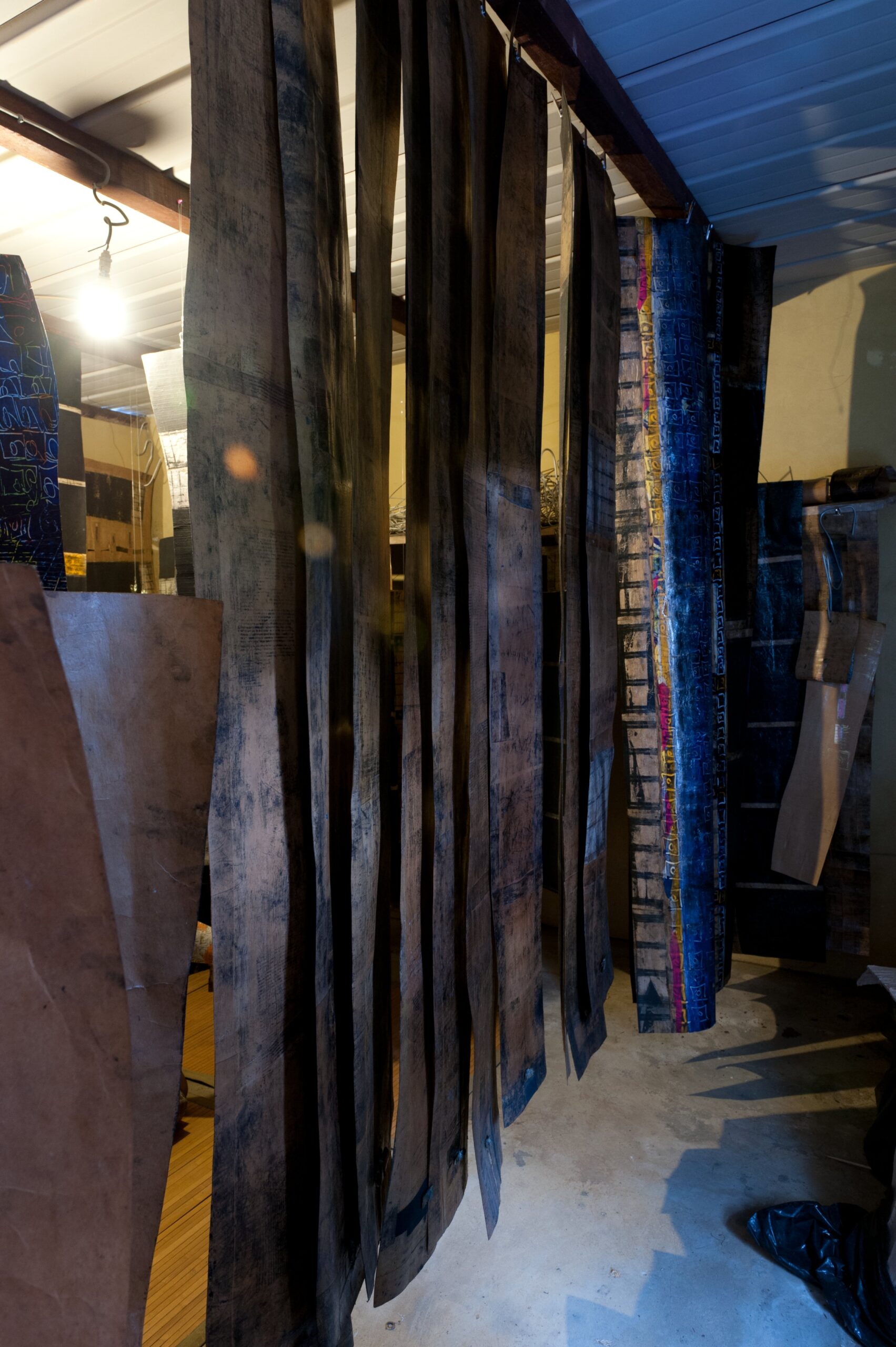 Dans un premier temps, les palimpsestes, ces œuvres tissées de papier, ont quitté l’atelier-œuvre de Trinité afin de territorialiser l’espace « atelier-laboratoire » de la Galerie B-Home à Dakar. Cette galerie, cette maison bleue, est aussi une forme de palimpseste, car elle a connu de nombreux passages et subi de nombreuses modifications apportées à sa structure d’origine. Le voyage m’a été nécessaire pour permettre le tissage. Je me suis approprié la galerie et l’ai passée au filtre d’Indigo pour permettre de nouveaux possibles. Le tremblement, la traversée, le mouvement, le doute, l’acceptation de l’autre ont été suscités, convoqués.