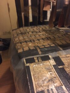 D. B. : Ta pratique basée entre autres choses sur le recouvrement, la superposition, la trace, nécessite-t-elle une organisation particulière de ton espace ? Peux-tu parler de ta pratique, de tes œuvres et de ce qu’elles entraînent en termes d’aménagement de ton espace ?