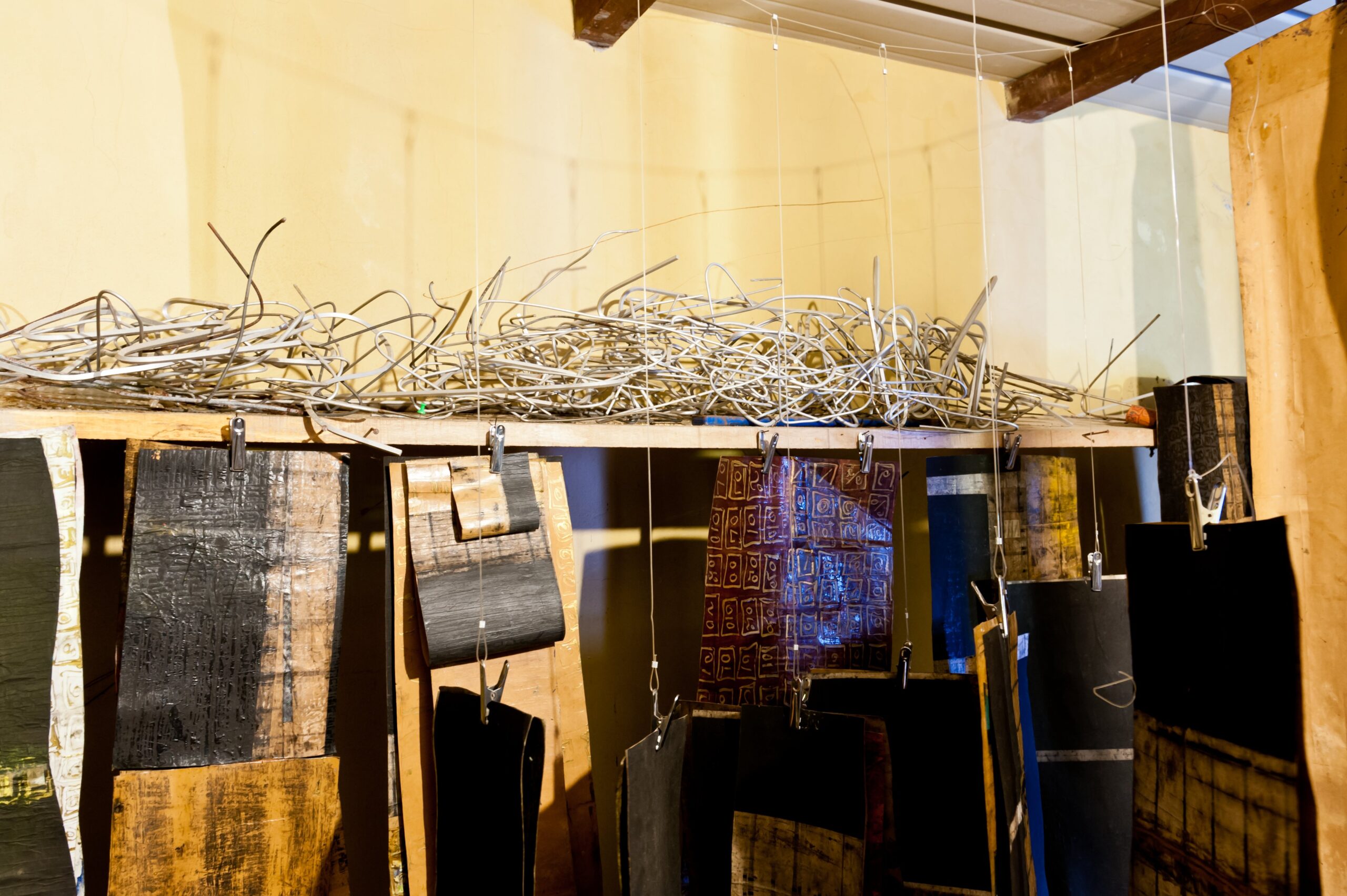 Devant une telle hétérogénéité, l’artiste se donne pour tâche de séparer pour mieux joindre, de réunir pour mieux dissocier. En fait, il est impossible d’isoler un élément sans considérer le tout, il est aussi utopique de clore l’unité en faisant fi des différences qui la composent. Il faut tisser ainsi, à la croisée de la matière et de mes errances, des liens ambivalents qui se forment par l’empiètement, la superposition des parties, fragments de l’œuvre à faire. C’est l’aventure de la création. C’est l’édification d’une trame qui prend en charge mes et nos histoires particulières. Je me sens tenue de faire cette remontée en mémoire. Ne suis-je pas l’héritière de ces esclaves, Africains déportés, ceux-là qui doivent réinventer la vie ? Ce sont ceux qu’Édouard Glissant appelle « les migrants nus ». Ceux dont le bagage se résume à des traces nébuleuses dans le repli de la mémoire. Nous sommes face à une mémoire fuyante, à conserver, une histoire éclatée à retenir, à restaurer, à inventer.