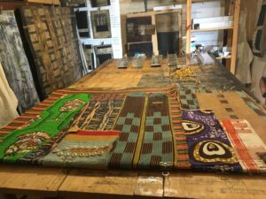 [Figure 6]D. B. : Tu as réalisé en 2022 une importante exposition à Dakar. Pour cela, tu as fait venir du matériel et des œuvres de Martinique, mais tu as aussi travaillé sur place. Cet atelier temporaire à Dakar t’a-t-il amenée à travailler de manière différente ? À l’occasion de cette exposition, tu as bénéficié de l’aide d’un assistant. Comment cette collaboration s’est-elle passée ?