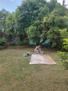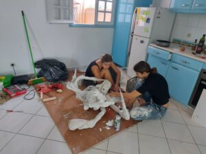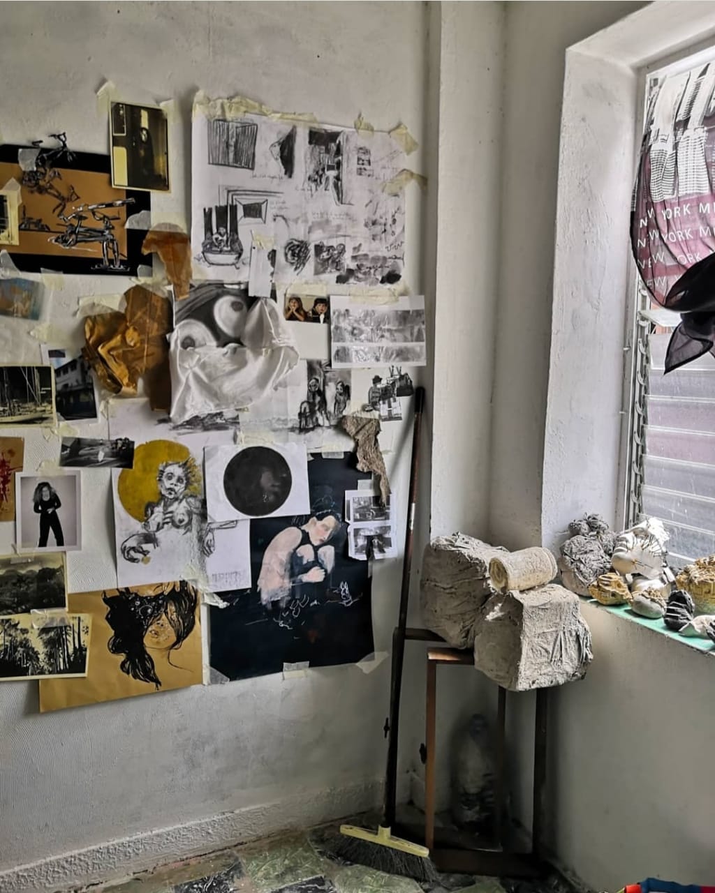 Très intéressées par l’architecture et les problématiques urbaines, nous nous sommes retrouvées plongées au cœur de nos inspirations, en plein centre-ville de Fort-de-France. De la fenêtre de l’atelier, nous voyions la rue et les bâtiments, entendions les voisins, sentions les odeurs du quotidien de la ville. Cela nous a permis d’avoir un nouveau regard, de collecter et de développer de nouveaux imaginaires. Le programme de résidence impliquait que d’autres artistes occupaient et visitaient des ateliers dans le même bâtiment. Des temps de rencontres et d’échanges étaient improvisés ou organisés afin d’enrichir nos pratiques respectives et créer une dynamique de groupe. Étant deux, nous formions déjà un groupe au sein du groupe.