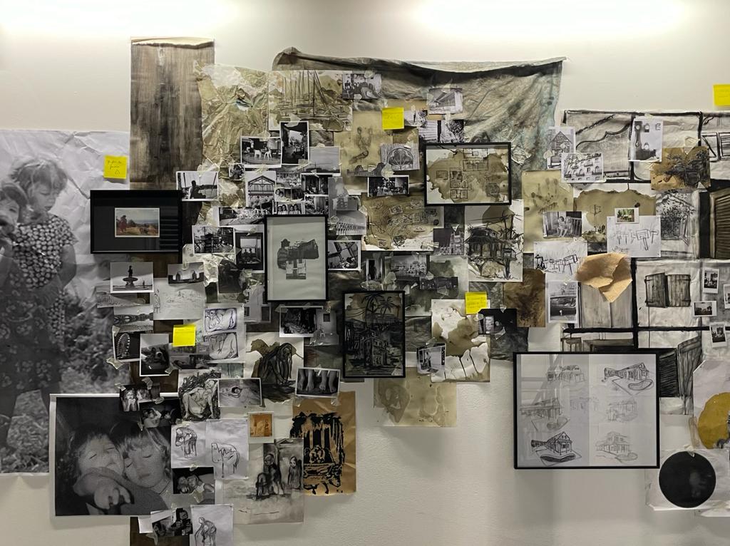 [Figure 1]Cet article établira une réflexion autour du partage d’atelier entre sœurs en Guadeloupe et Martinique, de la chambre d’enfant aux différents espaces que nous partageons aujourd’hui, en passant par les ateliers que nous avons investis en résidence. Le texte mettra en avant les particularités de notre pratique qui découlent des différentes formes de relation qui coexistent dans l’atelier, notamment la relation au lieu. Il détaillera en particulier la création d’un outil de communication que nous avons développé au sein de nos espaces de travail sous la forme d’un « mur des idées », où cohabitent pensées, messages, croquis, archives, etc.