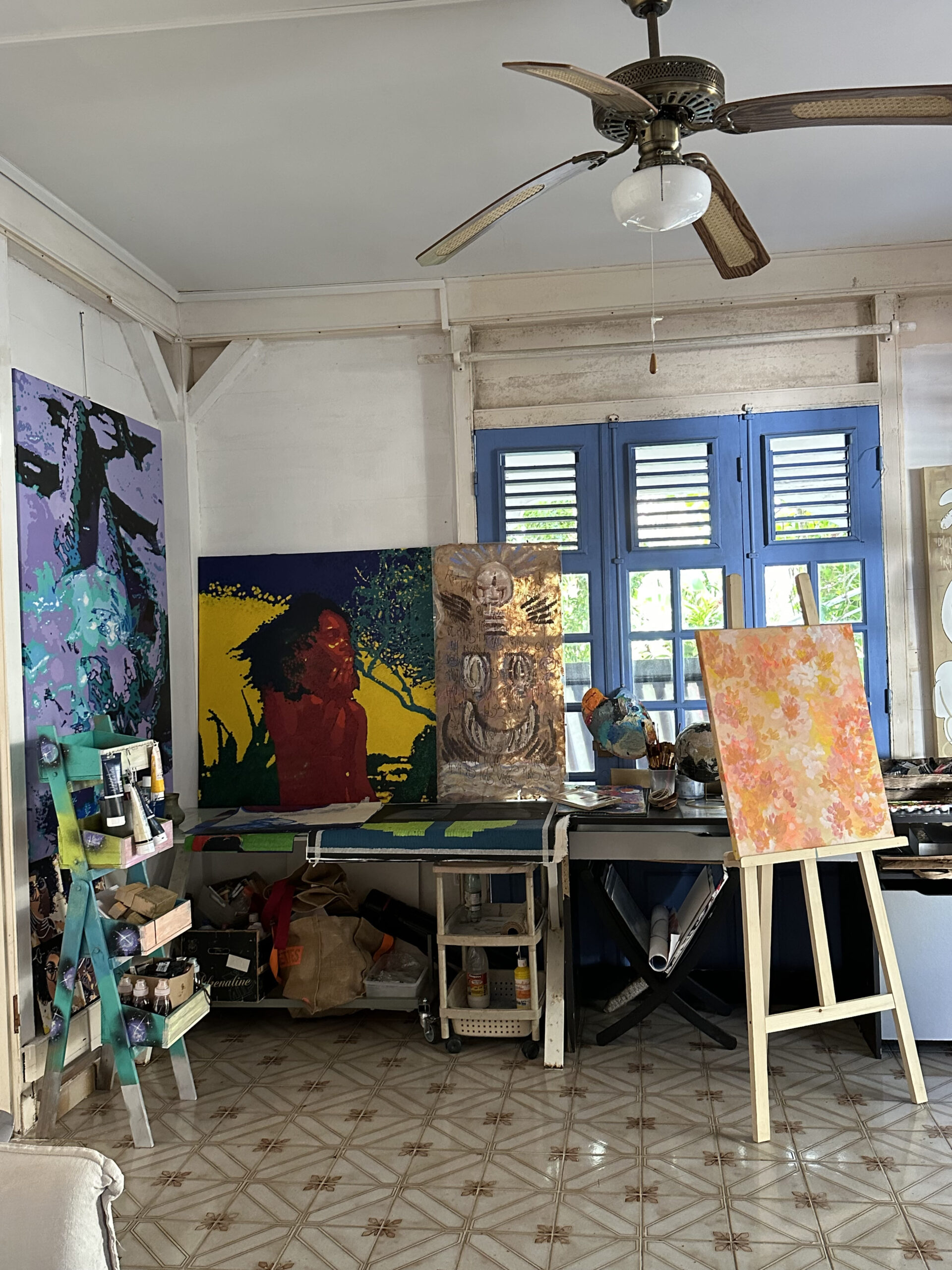 Ne disposant pas d’atelier à cette période, il pratique la peinture en bas de son bâtiment, à même le bitume. Il a alors déjà une relation particulière avec l’espace public. Il dispose aujourd’hui d’un atelier, situé en contrebas de son habitation, dans la ville des Abymes. Il y a deux ans, cet appentis a été victime d’un incendie qui l’a complètement ravagé, réduisant en fumée un nombre considérable d’œuvres.