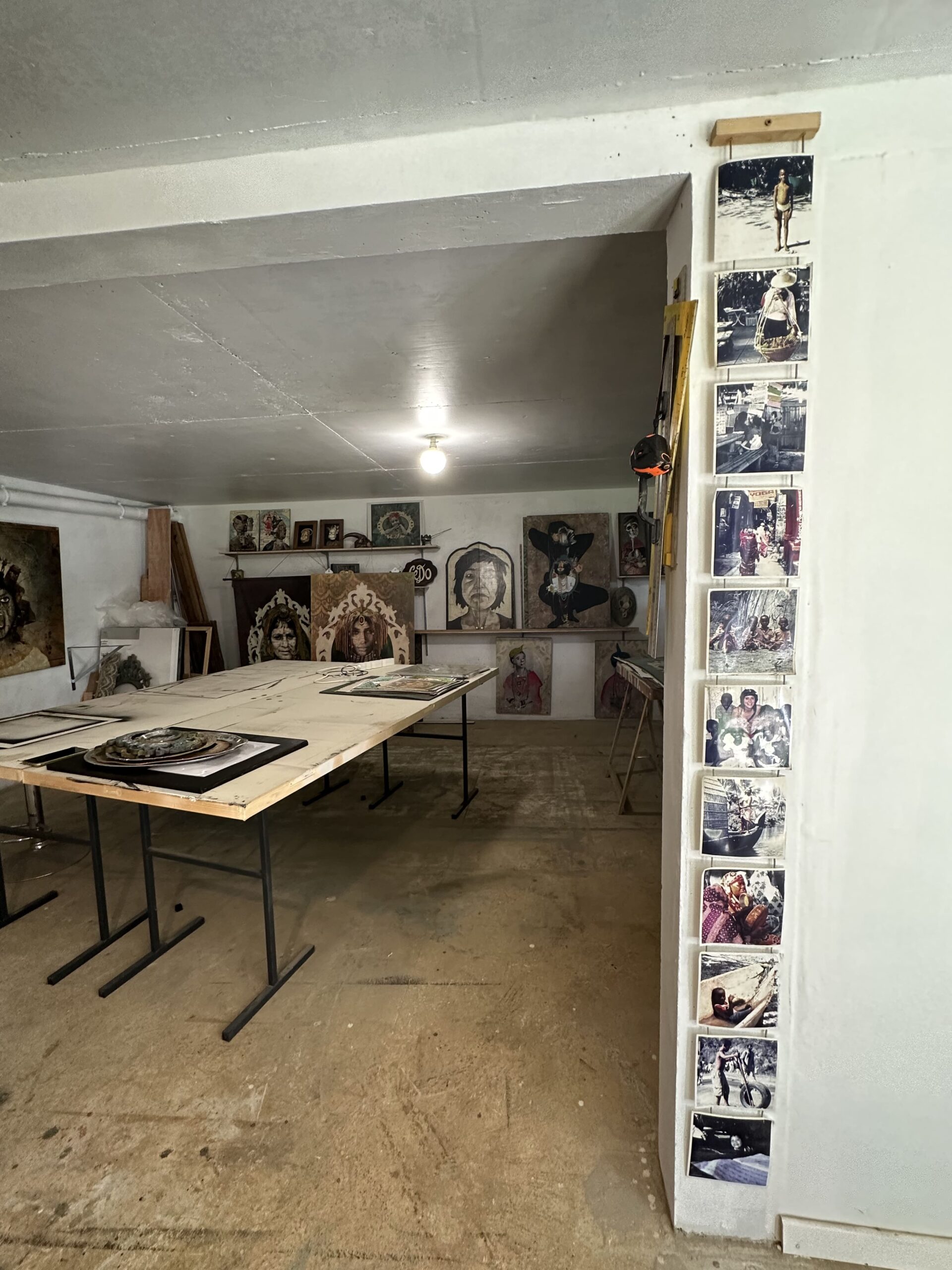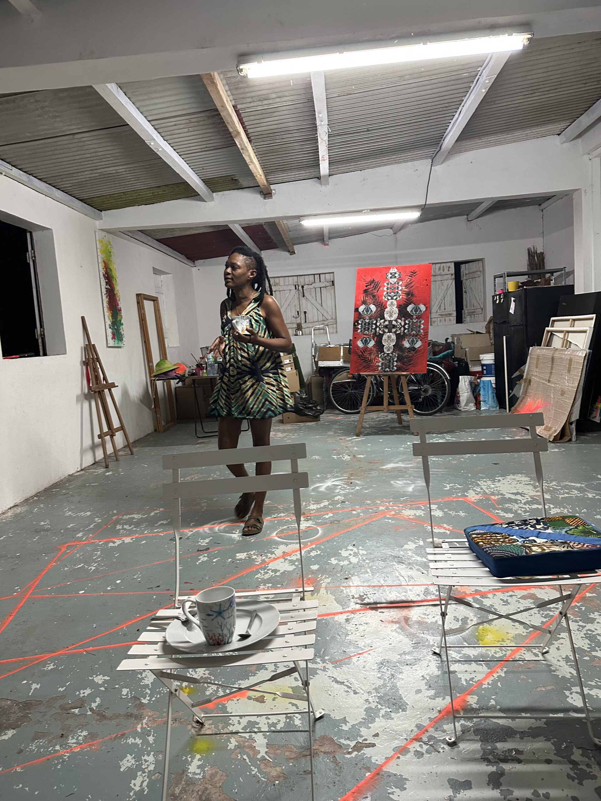 Alors en résidence artistique au Mémorial ACTe (Centre caribéen d’expressions et de mémoire de la Traite et de l’Esclavage), c’est dans une salle immense de l’établissement qu’il réalise la plupart de ses créations pendant un an et demi (de juillet 2022 à décembre 2023). Le musée lui permettra également d’y exposer ses œuvres. En effet, sa dernière exposition a réuni près de 200 œuvres dans l’allée principale. Lors de l’inauguration, le public était invité à traverser l’atelier de l’artiste, avant d’arriver à la première salle d’exposition. Laissé pour l’occasion « en l’état », envahi d’une quantité d’objets et de matériel en tout genre, l’atelier faisait alors partie intégrante de la scénographie et permettait une expérience immersive dans l’univers de l’artiste.