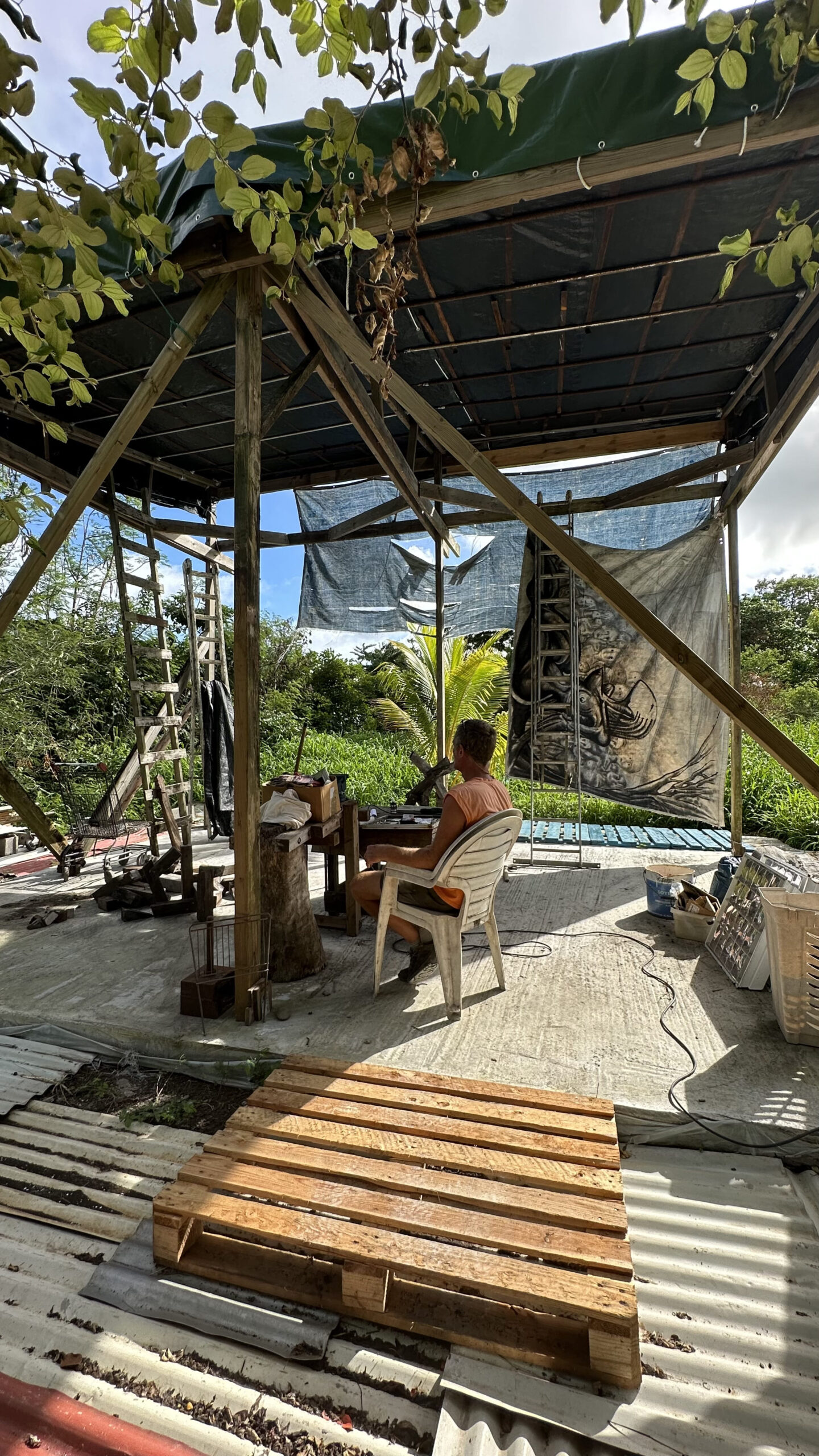 [Figure 4]Son atelier situé dans la commune de Saint-François est des plus rudimentaires. Il est constitué d’une dalle de béton et de quatre poteaux couverts d’une bâche en guise de toit. Une structure très légère, modulable et nomade qu’il a récupérée de son précédent atelier. Un investissement donc très minime qui implique de jongler avec les humeurs de la météo, mais l’artiste semble s’en accommoder. « En fonction de la lumière et du vent, c’est différent », confie-t-il. Dans son précédent atelier, la structure était fixée contre un mur. Dans cette seconde vie, l’atelier est totalement ouvert sur la nature.