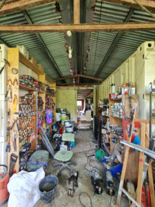 [Figure 5]Situé à quelques mètres de son habitation et jouxtant un champ de cannes à sucre, l’espace est intégré dans son environnement. L’espace est vaste et chargé de matériel en tout genre, il y fait relativement sombre. L’artiste s’essayant à plusieurs pratiques, il accumule une quantité et une variété de matériel assez importantes.